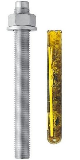 Ventajas : Conjunto ampolla y varilla inoxidable, taco químico M-12. Para hormigones de calidad inferior a 175 u otros.Para cancamos y plaquetas de fijación como punto de anclaje de fijación EN 795 Clase A.