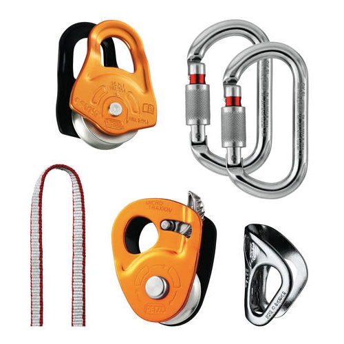 Contenido del kit: 1 polea MICRO TRAXION, 2 mosquetones OK SCREW-LOCK, 1 TIBLOC, 1 polea PARTNER y 1 cinta ST’ANNEAU 120 cm.