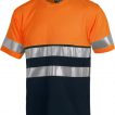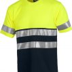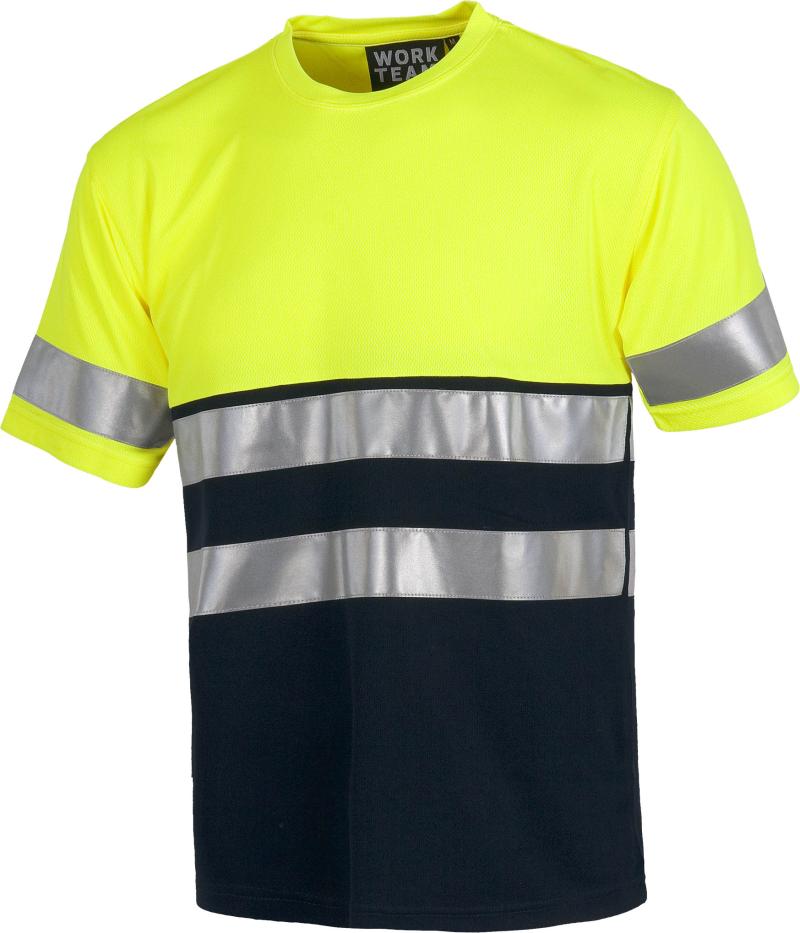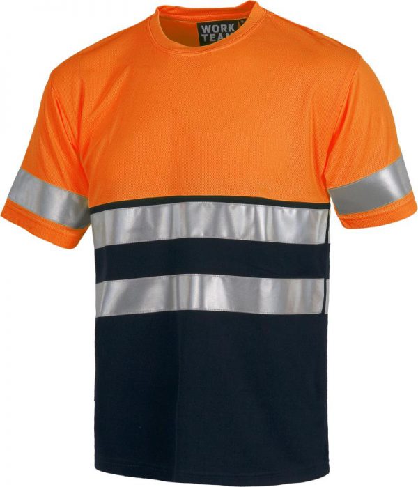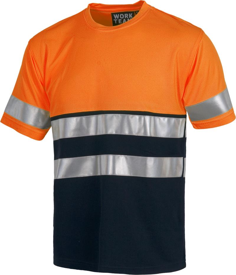 Ventajas : Camiseta M/C cuello redondo. Amarillo/Marino o Naranja/Marino. Dos bandas horizontales reflectantes de 5 cm. en el pecho y mangas.Tejido 100% transpirable.