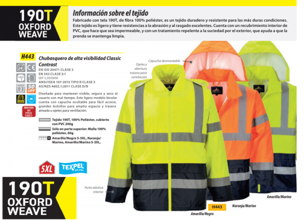 Ventajas : Chubasquero alta visibilidad traffic Contrast. Diseñado para mantener visible, seguro y seco al usuario con mal tiempo. Este ligero modelo bicolor cuenta con capucha ocultable para fácil acceso, grandes bolsillos para amplio espacio y trasera aireada u ojetes para ventilación. Fabricado con un patrón 190T, de fibra 100% poliéster, es un tejido duradero y resistente para las más duras condiciones. Este tejido es ligero y tiene resistencias a la abrasión y al rasgado excelentes. Cuenta con un recubrimiento interior de PVC, que hace que sea impermeable, y con un tratamiento repelente a la suciedad por el exterior, que ayuda a que la prenda se mantenga limpia. Estas prendas están totalmente certificadas según todas las normas europeas correspondientes. Tienen todas las costuras encintadas impermeables, tejido anti-absorbente en bordes y puños, cremalleras de buena calidad y resistentes corchetes metálicos. Otras características incluyen capucha ocultable bajo el cuello y aireación bajo la manga, para ventilación. Combina con pantalón referencia:H444, misma gama.( No incluye pantalón)