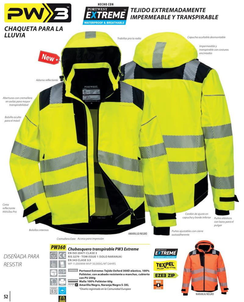 Ventajas : Chubasquero transpirable Extreme PW3® Portwest. El chubasquero transpirable PW3 Extreme es altamente impermeable y transpirable. Hecha con duradero tejido elástico resistente a manchas Oxford 300D recubierto con PU, esta chaqueta incluye muchos detalles destacables como la capucha con forma ergonómica, múltiples bolsillos con un espacio seguro, tecnología Ezee Zip y orificios con cremallera en axilas para una mayor aireación. Su diseño moderno y deportiva hechura combinan elegancia con prestaciones. Certificado CE. Impermeable y transpirable con costuras encintadas, para evitar la penetración de agua. Ligera y flexible cinta reflectante HiVisTex Pro segmentada para mayor visibilidad. El acabado Premium resistente a manchas repele aceites, agua y suciedad. 5 Bolsillos para mayor capacidad. Bolsillo oculto para el móvil. Bolsillos internos para mayor seguridad. Puños ajustables con cierre autoadherente para un firme ajuste. Adorno reflectante para mayor visibilidad . Costuras con puntada doble para una mayor duración