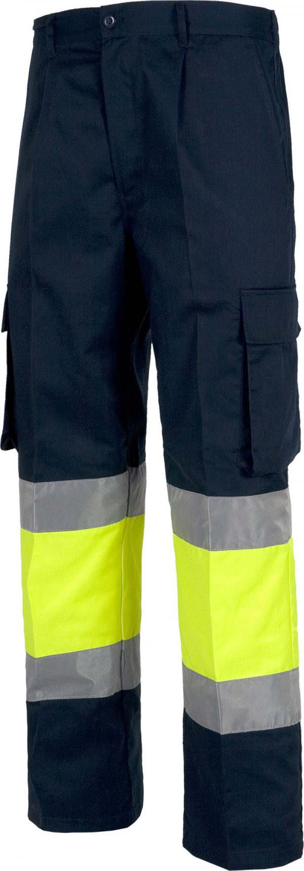 Ventajas : Pantalón recto, multibolsillos. Elástico en cintura. Trabillas. Dos bolsillos de apertura inclinada en los costados. Dos bolsillos de carga laterales con cartera y cierre de velcro. Dos bolsos traseros interiores con carteras de velcro. Tres cintas reflectantes en perneras. Combinado con alta visibilidad. Cierre de botón y bragueta de cremallera. Combina con referencia cazadora AV C4119 de mismas características 100% algodón