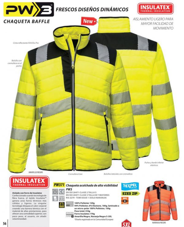 Ventajas : Chaqueta Baffle acolchada alta visibilidad PW3® Portwest. Esta chaqueta acolchada de alta visibilidad PW3, diseñada a conciencia, cuenta con cinta reflectante HiVisTex Pro para una mayor libertad de movimiento. El exterior de Ripstop de Poliéster combinado con el ligero aislante térmico Insulatex genera una solución ultrasuave e impermeable para su uso a la intemperie. Otras interesantes características incluyen cierre por cremallera Ezee Zip y bolsillos con cremallera para mayor seguridad.Tratamiento anti-manchasTexpel que repele la suciedad. El suave forro interior de Insulatex ofrece calidez y comodidad. Ligera y flexible cinta reflectante HiVisTex Pro segmentada para mayor visibilidad. La cremallera Ezee favorece un rápido y fácil enganche lo que la hace ideal tanto para usuarios diestros como zurdos. Bolsillos laterales con cremallera. Bolsillo con cremallera en el pecho. Totalmente forrada y acolchada, para atrapar el calor y aumentar la calidez. Puños y borde inferior elásticos, para confort y calidez.