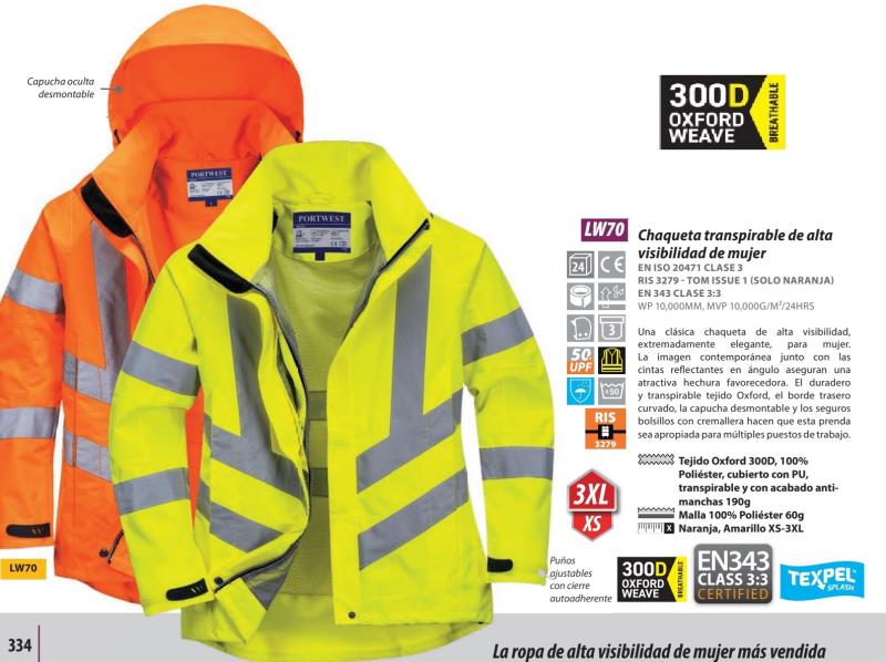 Ventajas : Chaqueta transpirable alta visibilidad Portwest® mujer. Una clásica chaqueta de alta visibilidad, extremadamente elegante, para mujer. La imagen contemporánea junto con las cintas reflectantes en ángulo aseguran una atractiva hechura favorecedora. El duradero y transpirable tejido Oxford, el borde trasero curvado, la capucha desmontable y los seguros bolsillos con cremallera hacen que esta prenda sea apropiada para múltiples puestos de trabajo. Certificado CE. Impermeable y transpirable con costuras encintadas, para evitar la penetración de agua. Cita reflectante para mayor visibilidad. Mangas ranglan para un cómodo ajuste. 4 Bolsillos para mayor capacidad. Bolsillos con cremalleras. Frontal con tapeta antiaguaceros, para proteger contra los elementos. Capucha oculta desmontable para cuando se requiera. Borde trasero curvado para más protección. Puños ajustables con cierre autoadherente para un firme.