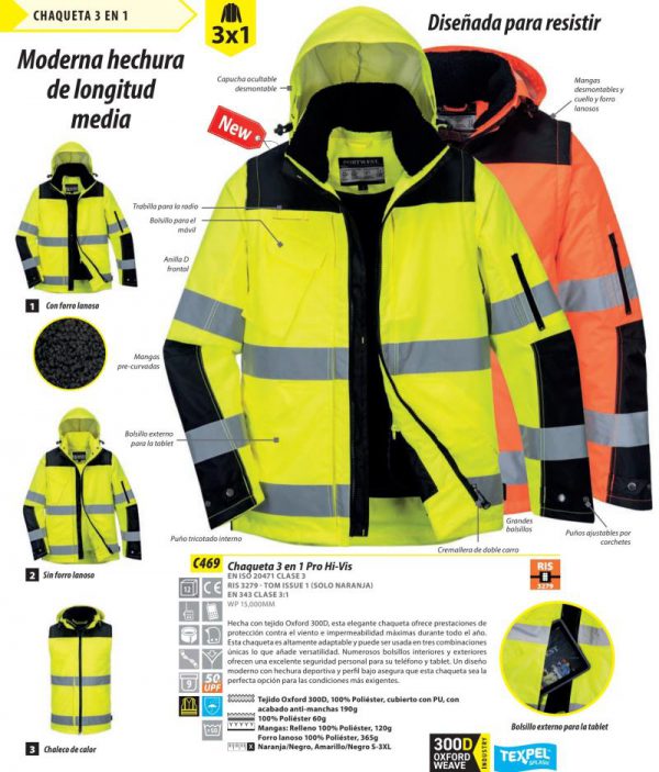 Ventajas : Parka 3X1 alta visibilidad Pro Hi-Vis Portwest®. Hecha con tejido Oxford 300D, esta elegante chaqueta ofrece prestaciones de protección contra el viento e impermeabilidad máximas durante todo el año. Esta chaqueta es altamente adaptable y puede ser usada en tres combinaciones únicas lo que añade versatilidad. Numerosos bolsillos interiores y exteriores ofrecen una excelente seguridad personal para su teléfono y tablet. Un diseño moderno con hechura deportiva y perfil bajo asegura que esta chaqueta sea la perfecta opción para las condiciones más exigentes.Impermeable con las costuras encintadas evita la penetración de agua. Cita reflectante para mayor visibilidad. Las mangas desmontables y cuello y forro lanosos facilitan diferentes modos de uso. Chaqueta multi-uso que se puede usar de tres formas. 9 Bolsillos para mayor capacidad. Bolsillo para el móvil. Cremallera de doble carro para un acceso rápido y fácil. Capucha ocultable desmontable. Trabilla para sujetar fácilmente la radio.