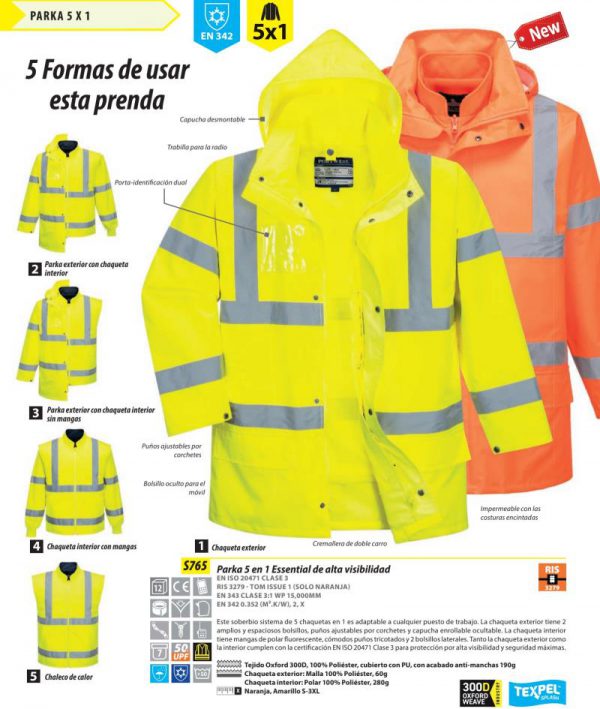 Ventajas : Parka 5X1 alta visibilidad Portwest®. Este soberbio sistema de 5 chaquetas en 1 es adaptable a cualquier puesto de trabajo. La chaqueta exterior tiene 2 amplios y espaciosos bolsillos, puños ajustables por corchetes y capucha enrollable ocultable. La chaqueta interior tiene mangas de polar fluorescente, cómodos puños tricotados y 2 bolsillos laterales. Tanto la chaqueta exterior como la interior cumplen con la certificación EN ISO 20471 Clase 3 para protección por alta visibilidad y seguridad máximas.Impermeable con las costuras encintadas evita la penetración de agua. Cita reflectante para mayor visibilidad. La chaqueta multi-uso que se puede usar de 5 formas. Chaqueta interior desmontable, para mayor versatilidad en todo tiempo. 7 Bolsillos para mayor capacidad. Bolsillo oculto para el móvil. Cremallera de doble carro para un acceso rápido y sencillo. Capucha desmontable para mayor practicidad. Puños con corchetes para un firme ajuste.