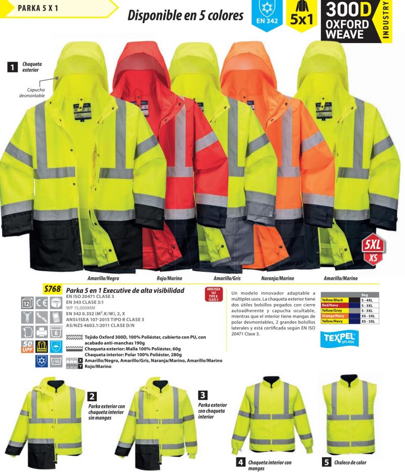 Ventajas : Parka 5X1 alta visibilidad Portwest®. Este soberbio sistema de 5 chaquetas en 1 es adaptable a cualquier puesto de trabajo. La chaqueta exterior tiene 2 amplios y espaciosos bolsillos, puños ajustables por corchetes y capucha enrollable ocultable. La chaqueta interior tiene mangas de polar fluorescente, cómodos puños tricotados y 2 bolsillos laterales. Tanto la chaqueta exterior como la interior cumplen con la certificación EN ISO 20471 Clase 3 para protección por alta visibilidad y seguridad máximas.Impermeable con las costuras encintadas evita la penetración de agua. Cita reflectante para mayor visibilidad. La chaqueta multi-uso que se puede usar de 5 formas. Chaqueta interior desmontable, para mayor versatilidad en todo tiempo. 7 Bolsillos para mayor capacidad. Bolsillo oculto para el móvil. Cremallera de doble carro para un acceso rápido y sencillo. Capucha desmontable para mayor practicidad. Puños con corchetes para un firme ajuste.