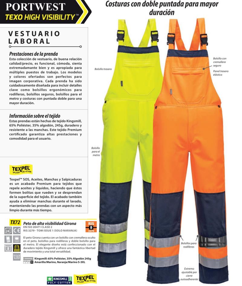 Ventajas : Peto de alta visibilidad Portwest® Girona. Este nuevo añadido a la colección de alta visibilidad Portwest Texo cuenta con un bolsillo con cremallera en el peto oculto, bolsillos para rodilleras y doble bolsillo para el metro. El elegante diseño está confeccionado con el duradero tejido Kingsmill y ofrece una fantástica libertad de movimiento y una total versatilidad. Esta colección de vestuario, de buena relación calidad/precio, es funcional, cómoda, sienta extremadamente bien y es apropiada para múltiples puestos de trabajo. Los modelos y colores ofertados son perfectos para imagen corporativa. Cada prenda ha sido cuidadosamente diseñada para incluir detalles clave como bolsillos ergonómicos para rodilleras, bolsillos seguros, bolsillos para el metro y costuras con puntada doble para una mayor duración. Estas prendas están hechas de tejido Kingsmill, 65% poliéster, 35% algodón, 245g, duradero y resistente a las manchas. Este tejido Premium certificado garantiza altas prestaciones y comodidad para el usuario. Texpel es un tratamiento repelente de manchas que protege contra las salpicaduras cotidianas sin alterar la comodidad de la prenda. Los líquidos forman gotas y caen de la prenda, de forma que las salpicaduras pueden ser rápidamente limpiadas.Combina con chaqueta referencia: TX70, misma gama