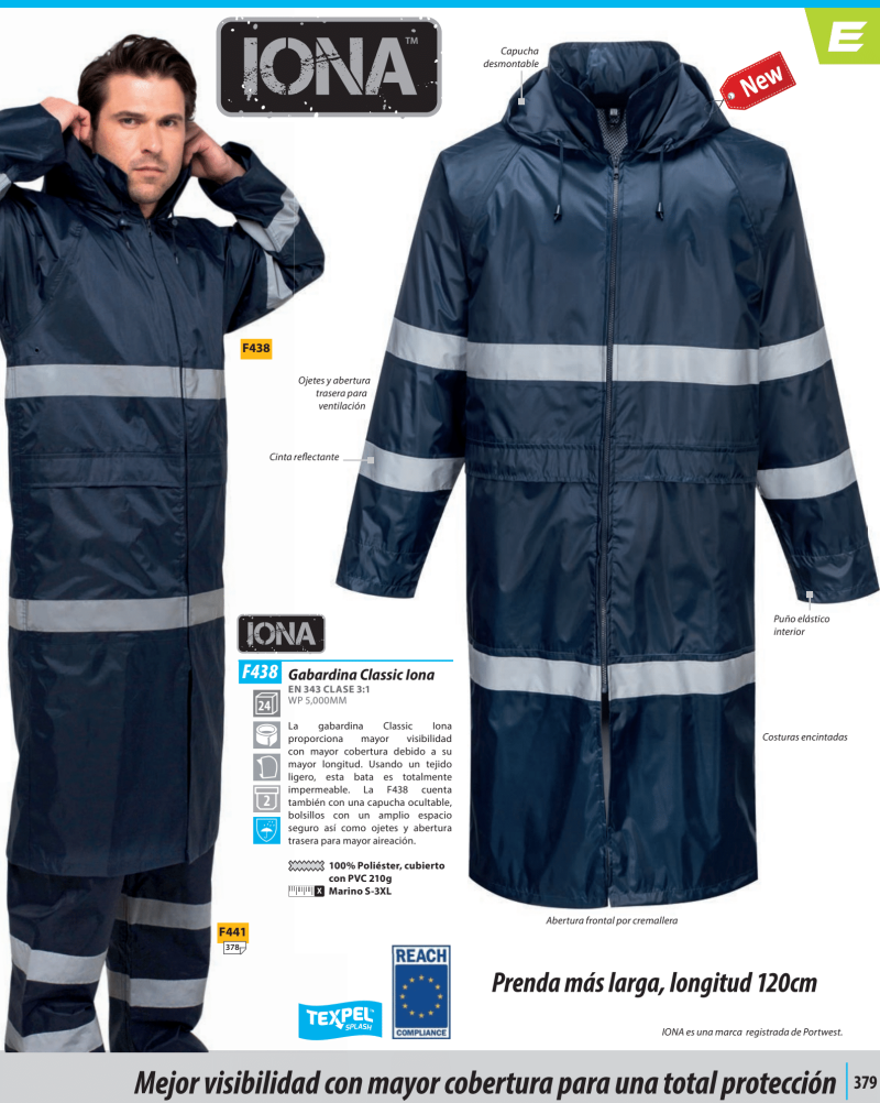Ventajas : Gabardina chubasquero Portwest Iona Classic®. La gabardina Classic Iona proporciona mayor visibilidad con mayor cobertura debido a su mayor longitud. Usando un tejido ligero, esta bata es totalmente impermeable. La F438 cuenta también con una capucha ocultable, bolsillos con un amplio espacio seguro así como ojetes y abertura trasera para mayor aireación. Tejido ligero, transpirable con costuras encintadas que evita la penetración de agua. Costuras encintadas para protección adicional. Cita reflectante para mayor visibilidad. Fácil abertura frontal por cremallera. 2 bolsillos seguros. Capucha desmontable para mayor practicidad. Puño elástico interior. Parte trasera superior aireada y ojetes para mayor transpiración y comodidad. Acabado del tejido extremadamente impermeable, el agua forma bolitas que ruedan de la superficie del tejido.
