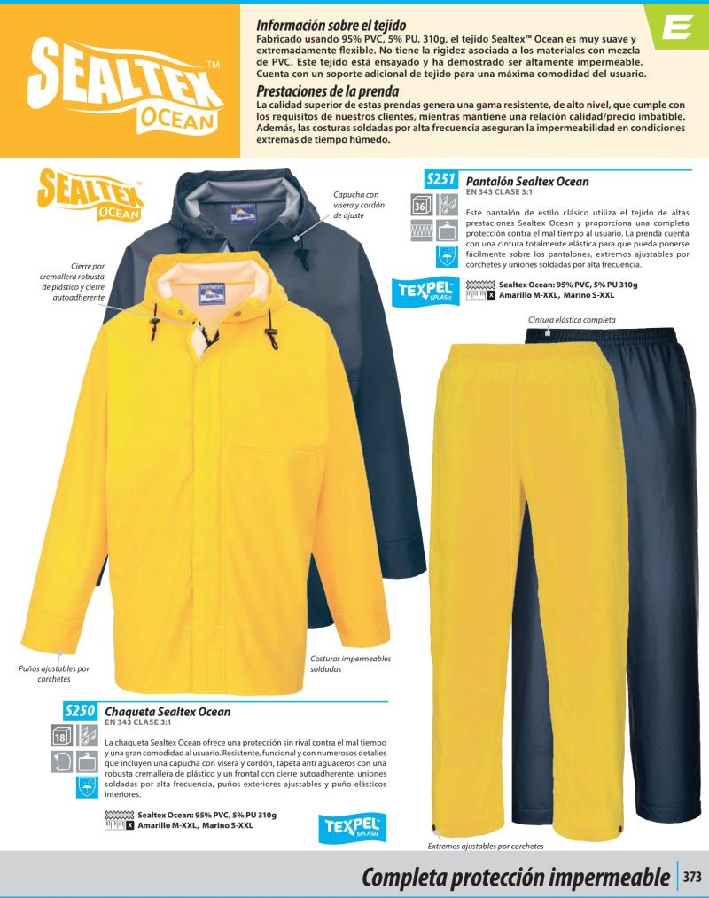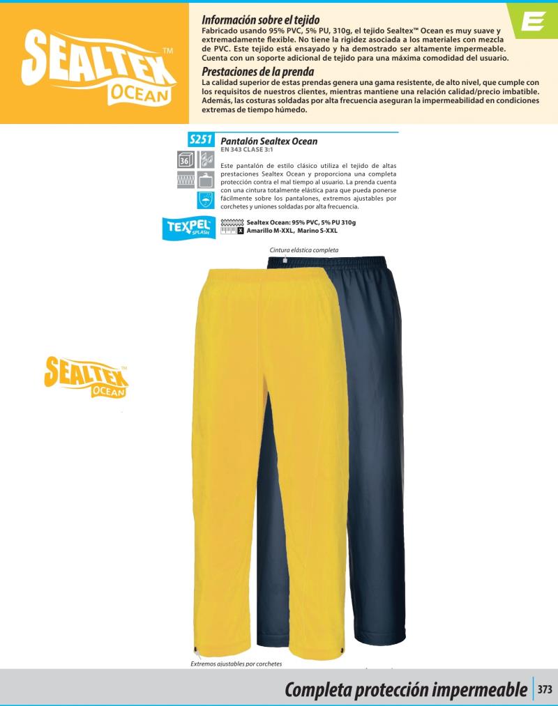Ventajas : Pantalón chubasquero Portwest Sealtex Ocean®. Este pantalón de estilo clásico utiliza el tejido de altas prestaciones Sealtex Ocean y proporciona una completa protección contra el mal tiempo al usuario. La prenda cuenta con una cintura totalmente elástica para que pueda ponerse fácilmente sobre los pantalones, extremos ajustables por corchetes y uniones soldadas por alta frecuencia. Duradera y flexible con acabado para limpieza con paño. Impermeable con costuras soldadas para evitar la penetración de agua. Cintura elástica completa para el mayor nivel de comodidad. Extremos con corchetes para un firme ajuste. Bolsa expositora que ayuda a la presentación para la venta en tienda. Acabado del tejido extremadamente impermeable, el agua forma bolitas que ruedan de la superficie del tejido.Combina con chaqueta S250 mismas características técnicas.