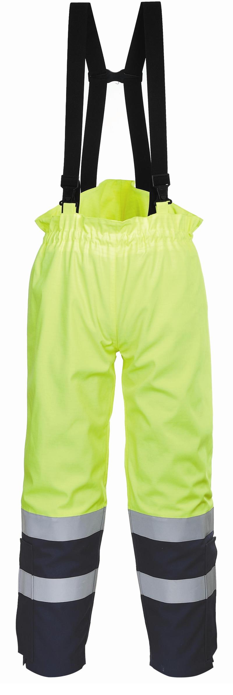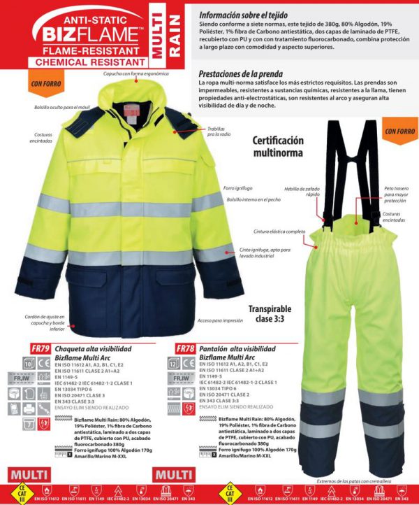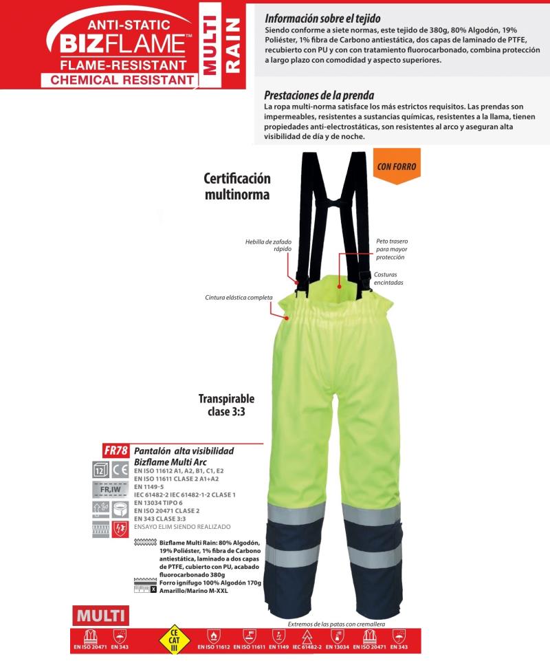 Ventajas : Pantalón alta visibilidad Portwest Modaflame Multi Norm ARC®. Este cómodo pantalón proporciona una protección óptima en entornos multi-riesgo. Los tirantes elásticos permiten la máxima facilidad de movimiento durante la jornada laboral. Ideal combinado con la parka FR79. CE-CAT III . El tejido impermeable tratado, resistente a la llama, evita la penetración de agua. Protege contra el calor radiante y el convectivo. Protección certificada contra salpicaduras de metal fundido. Cinta resistente a la llama para coser, apta para lavado industrial. Tejido transpirable que retira la humedad del cuerpo manteniendo fresco y confortable al usuario. Forro de algodón resistente a la llama para mayor calidez y comodidad. Extremos de las patas con cremallera, para ajustar sobre las botas. Costuras encintadas para protección adicional. Cintura elástica completa para el mayor nivel de comodidad. Combina con chaqueta mismas características referencia: FR79.