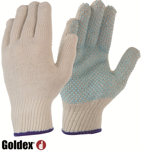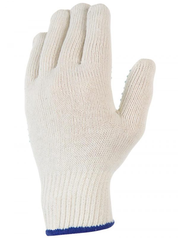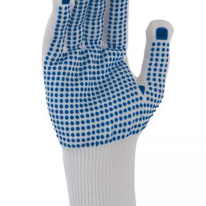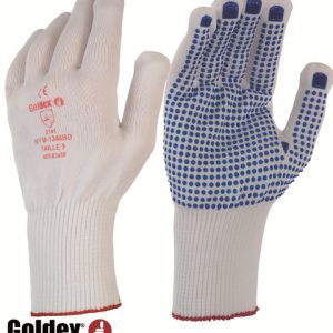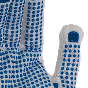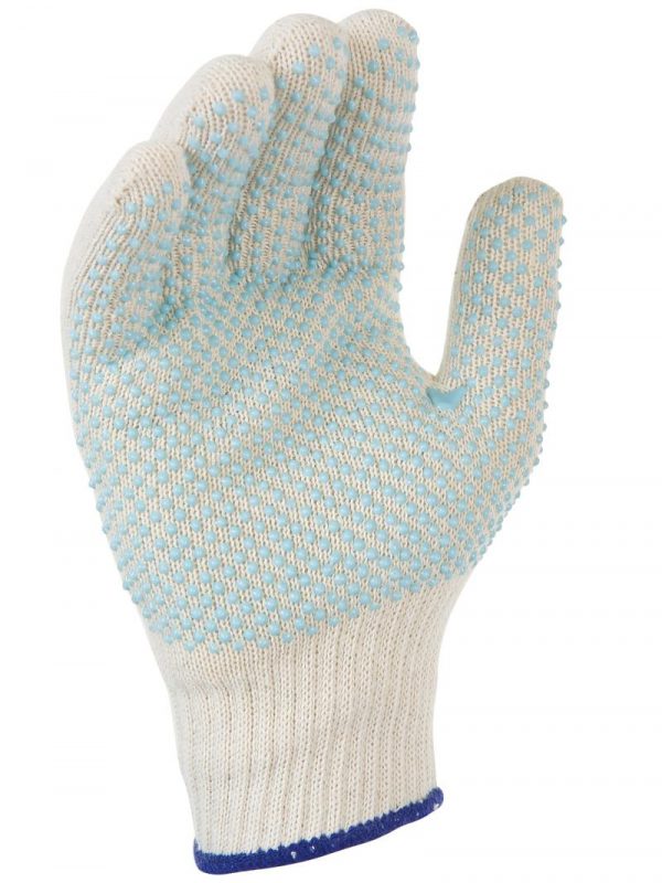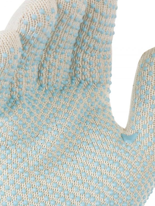 Ventajas : Fabricación ISO9002. Fibra poliéster, más resistante, mezclado con algodón para el bienestar del usuario. Confort de un guante sin costura (no aspereza). Mejor agarre gracias a los puntos de PVC.
