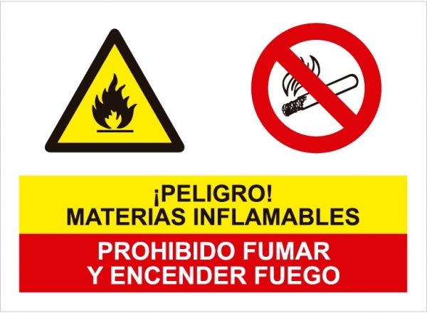 Epi Balear > Productos > SEÑALIZACIÓN > Paneles > Compuestos > Peligro materias inflamables prohibido fumar encender fuego.SCR-1005