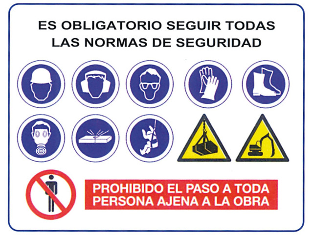 Señal con pictogramas básicos de obligación (azul), advertencia (amarillo) y prohibición (rojo). útil para entrada a obras, naves, etc…