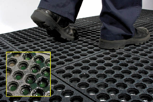 Ventajas: Fabricada en caucho natural de alta resistencia. Suministrando una superficie seca en condiciones húmedas o aceitosas. Drenaje de líquidos vía agüeros. Extremadamente cómodo de pie, reduciendo la fatiga con efectividad. Conectores disponibles para unir alfombras en zonas amplias. Existen bordes en longitudes de 1m y 1.5 m para añadir terminaciones a la alfombra o conectores para unir alfombras.Dimensiones: 1.0 x 1.5 m.