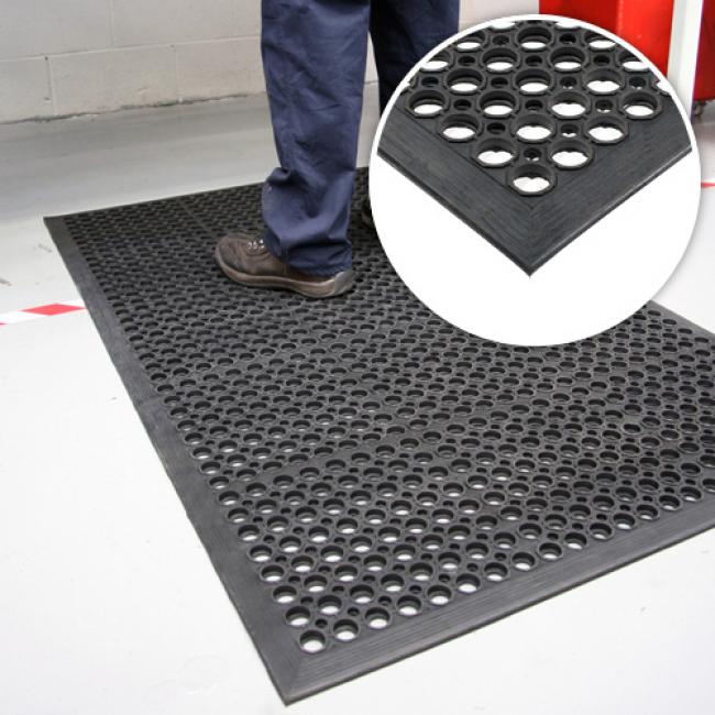 Ventajas: Fabricado con caucho SBR altamente resistente. Alfombra antifatiga económica. Superficie de círculos en relieve que ofrece una mayor resistencia a resbalones. Bordes achaflanados para reducir tropezones. Acorde con la prueba de resistencia al deslizamiento EN 13552 Categoría R10. Conectores disponibles para unir alfombras en zonas amplias. Existen bordes en longitudes de 1m y 1.5 m para añadir terminaciones a la alfombra o conectores para unir alfombras. Dimensiones: 1.0 x 1.5 m